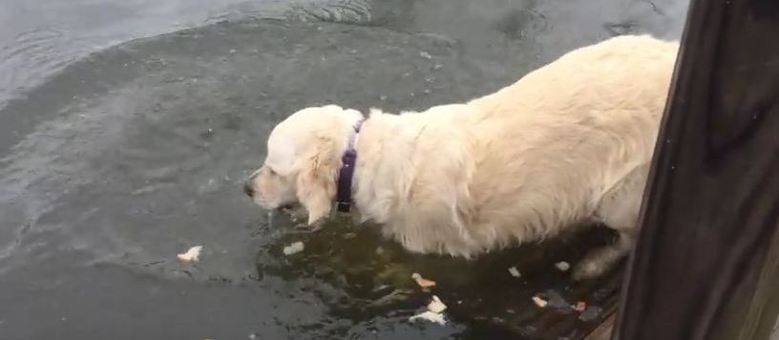Um golden retriever parece estar influenciando a evolução da espécie dele, ao caçar um peixe ficando perto de um pedaço de pão. Enquanto esperava pacientemente, o caçador observou perto de que pedaço de pão o peixe iria e o fisgou com uma mordida. Foi fatal.